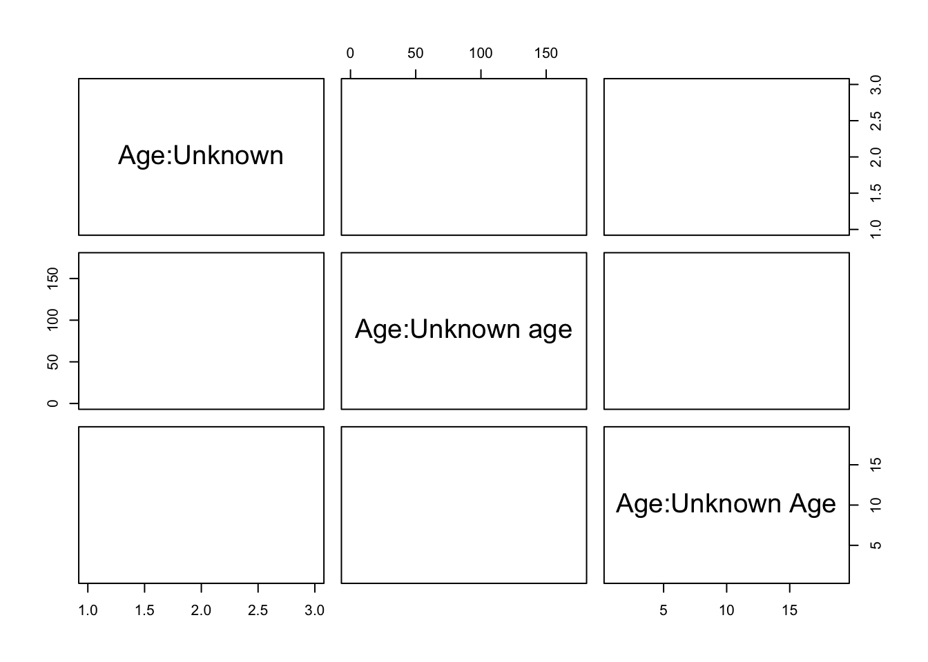 pairs(~`Age:Unknown` + `Age:Unknown age` + `Age:Unknown Age`, data=myData )